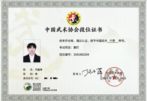 代鑫海是校散打队的核心队员。在杨雷等教练团队的精心指导下,他与队友们刻苦训练,作风顽强。在2025年中国大学生武术散打锦标赛上,他凭借顽强的意志、精湛的技术和稳定的心态,勇夺个人亚军和团体亚军,闪耀全国赛台。2025年11月,他的武术造诣再获权威认可,被中国武术协会授予散打项目六段称号。从县级田径赛场的奔跑,到全国散打赛台的搏击,他不断挑战自我,展现了卓越的体育素养和拼搏精神。