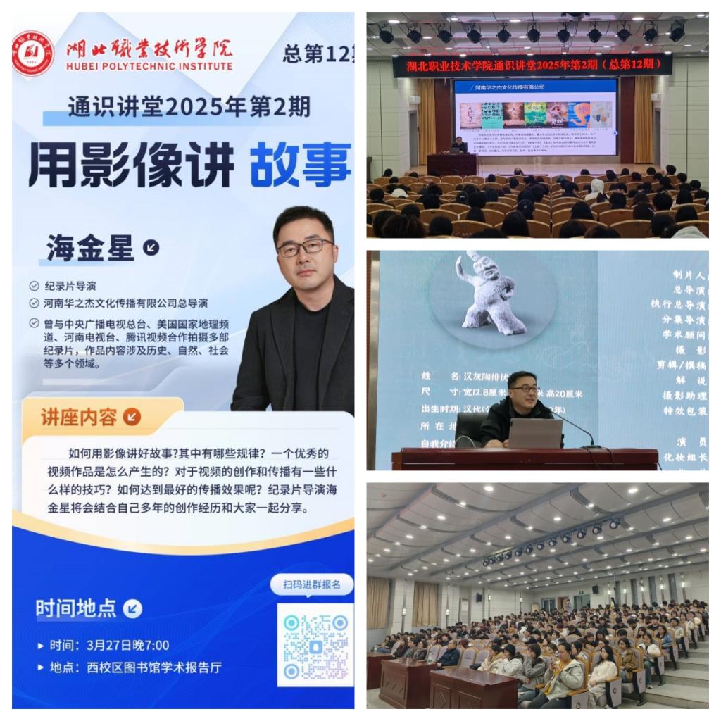 (通讯员 祝非凡)3月27日,由党委学生工作部主办、图书馆承办的学校第十二期“通识讲堂”在西区文博馆学术报告厅开讲。本次讲座特邀河南华之杰文化传播有限公司总导演海金星,以“用影像讲故事”为主题,为师生们带来了一场别开生面的讲座,现场300余名师生聆听了讲座。