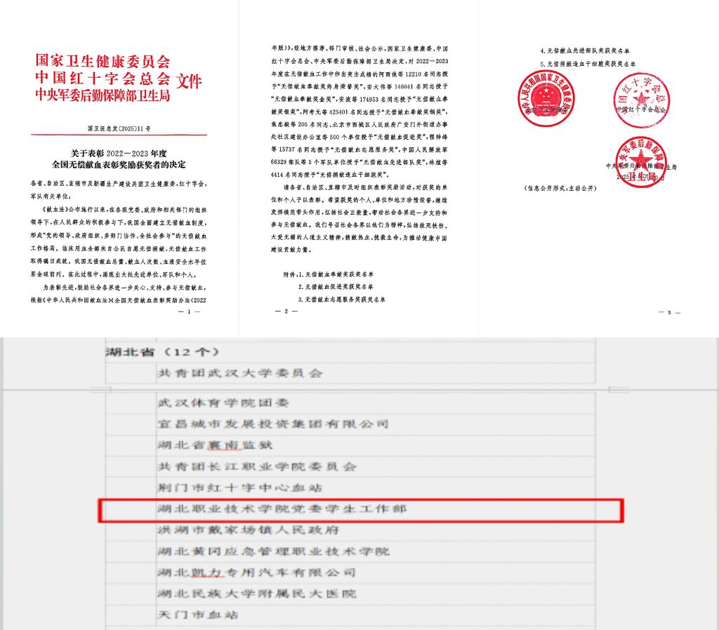 (通讯员 王欣怡)近日,国家卫生健康委、中国红十字会总会、中央军委后勤保障部卫生局联合下发表彰通报,对2022-2023年度在全国无偿献血工作中表现突出的先进单位与个人予以隆重表彰,我校凭借在无偿献血公益事业中的扎实举措与显著成效,成功斩获“全国无偿献血促进奖”。这一国家级荣誉是对无偿献血工作的最高级别认可,彰显了我校在引导青年学子践行公益、传递大爱方面的示范引领作用,标志着学校无偿献血工作已跻身全国高校前列。